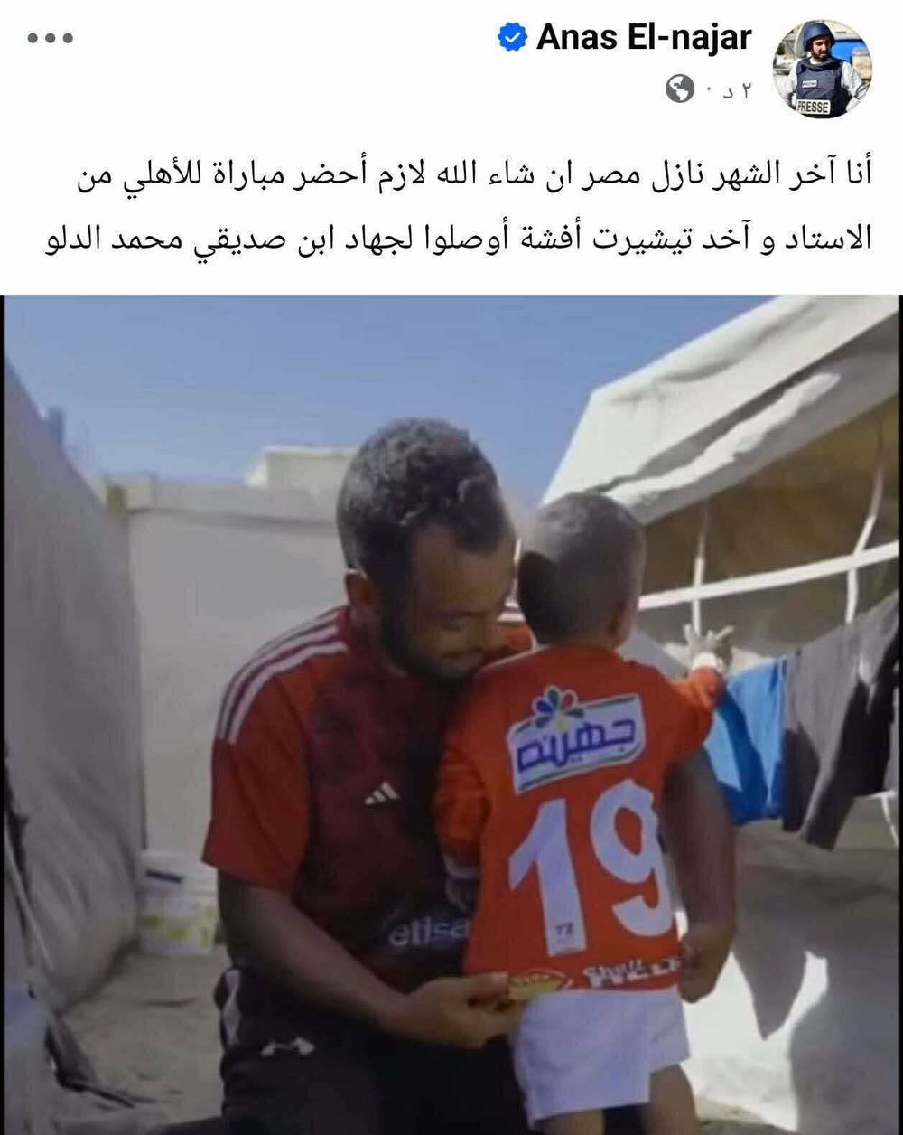 وقال النجار عبر حسابه الرسمي على «الفيسبوك»: «أنا آخر الشهر نازل مصر إن شاء الله لازم أحضر مباراة للأهلي من الاستاد وآخد تيشيرت أفشة أوصله لجهاد ابن صديقي محمد الدلو».